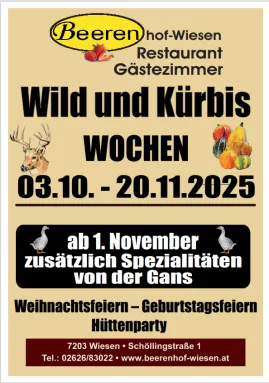 Im Beerenhof hat Genuss höchste Priorität! Wochentags verwöhnen wir unsere Gäste mit drei Mittagsmenüs (Suppe, Hauptspeise, Dessert) und bieten diese Menüs auch zum Mitnehmen an. Unsere Köche sorgen für einen abwechlsungsreichen Menüplan mit zahlreichen klassischen, österreichischen Schmankerln sowie einer vegetarischen Variante. Hausgemacht ist natürlich auch unser Dessert, dass das Herz jeder Naschkatze höher schlagen lässt. Abseits vom Menü bieten wir zahlreiche Speisen sowie Pizzen und saisonale Köstlichkeiten im Zuge unserer Schmankerlwochen. Melden Sie sich für unseren Newsletter an oder bleiben Sie hier auf unserer Homepage und auf Facebook immer am neuesten Stand!